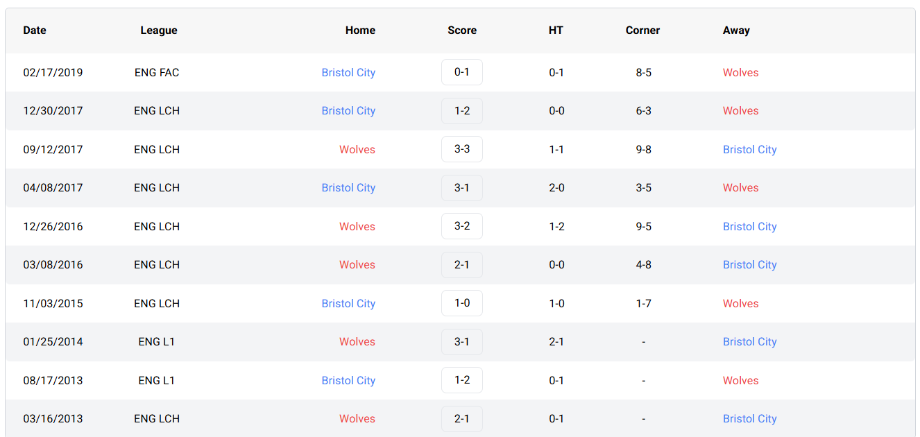H2H Results for Bristol City vs Wolves