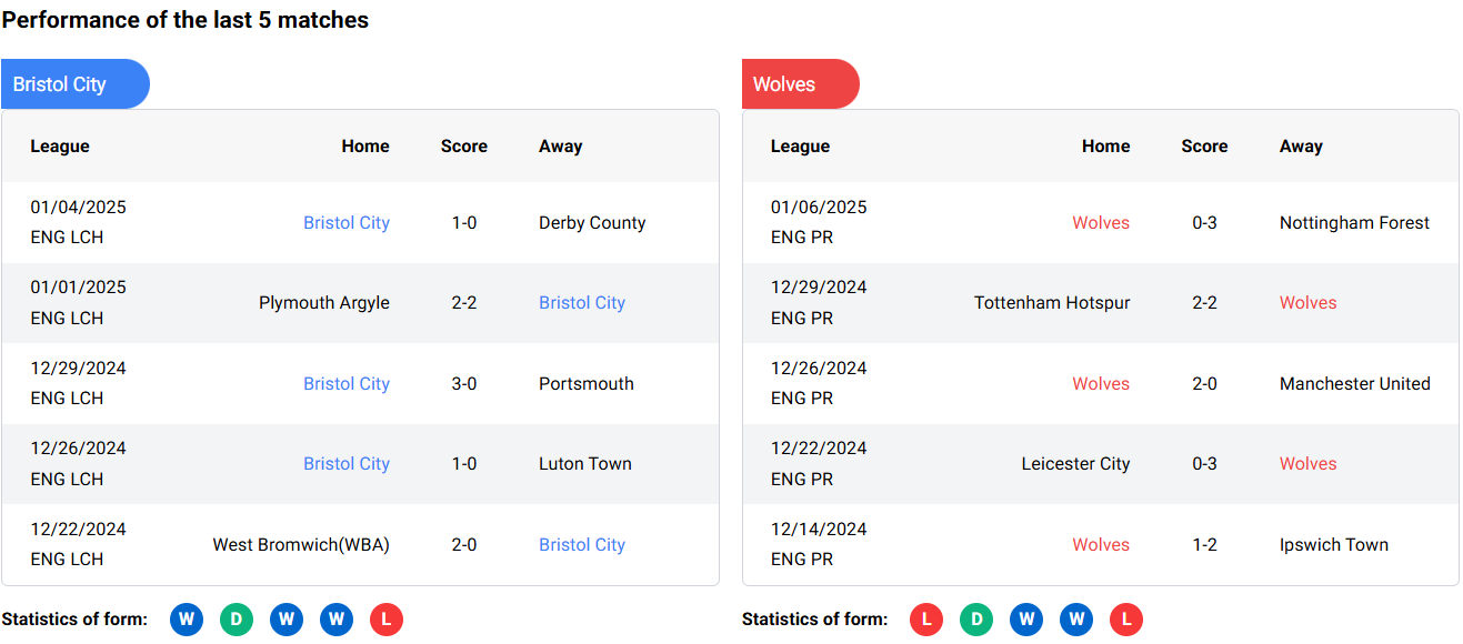 Bristol City and Wolves have faced each other 68 times in the past. Wolves have dominated the encounters, winning 37 times, while Bristol City has won 15 times, and 16 matches have ended in draws. The last time these two teams met was in the 2018-19 FA Cup, with Wolves winning 1-0.