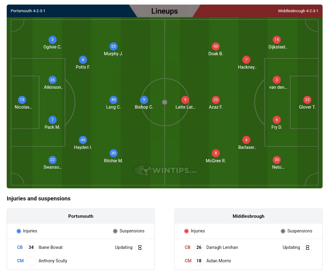 Predicted Lineups for Portsmouth vs Middlesbrough