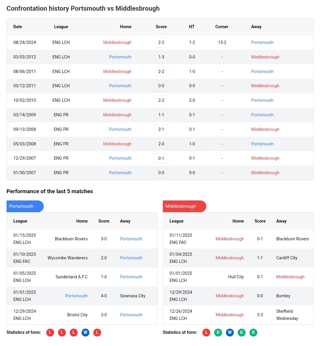 H2H Results for Portsmouth vs Middlesbrough